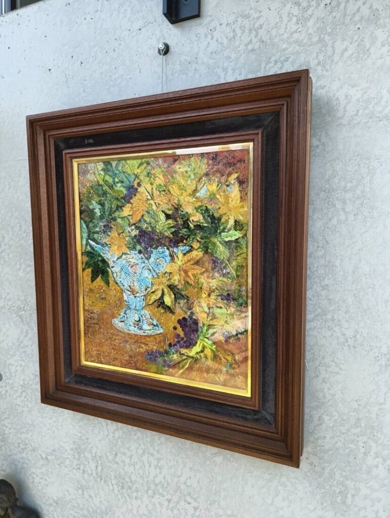 #出岡実(いずおか みのる、1929–2001)は東京都出身の洋画家で、油彩を中心に静物や花、風景、仏画など多彩な題材を描いた作家です。油彩を生かした厚塗りで力強い筆致と鮮やかな色彩が特徴で、静物や花のモチーフを瑞々しく描く一方、仏像や天女など宗教的題材の制作や、寺院壁画や公共壁画の制作といった大作制作も行った画家です。