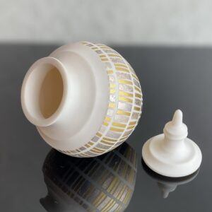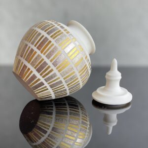 今回出品の作品は金箔と銀箔を1枚ずつ貼り付け、800℃で焼き上げています。デザインと手間に惜しみない労力を注いだ作品です。