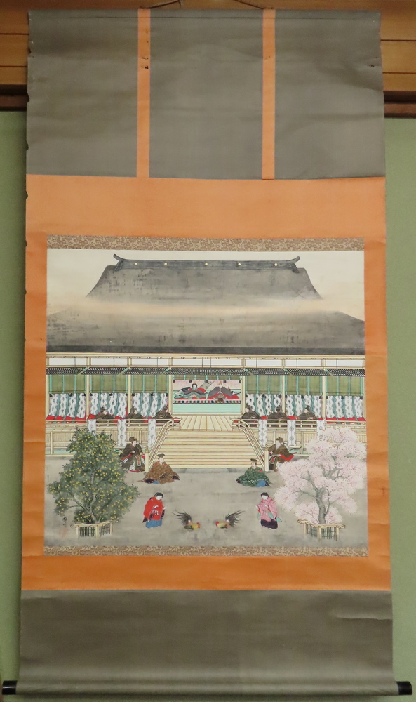 この紫宸殿の前に、天皇から見て左に桜、右に橘が植えられており、「左近の桜」「右近の橘」と呼ばれていました。それにならい、ひな人形の桜•橘も、同じように並べられています。